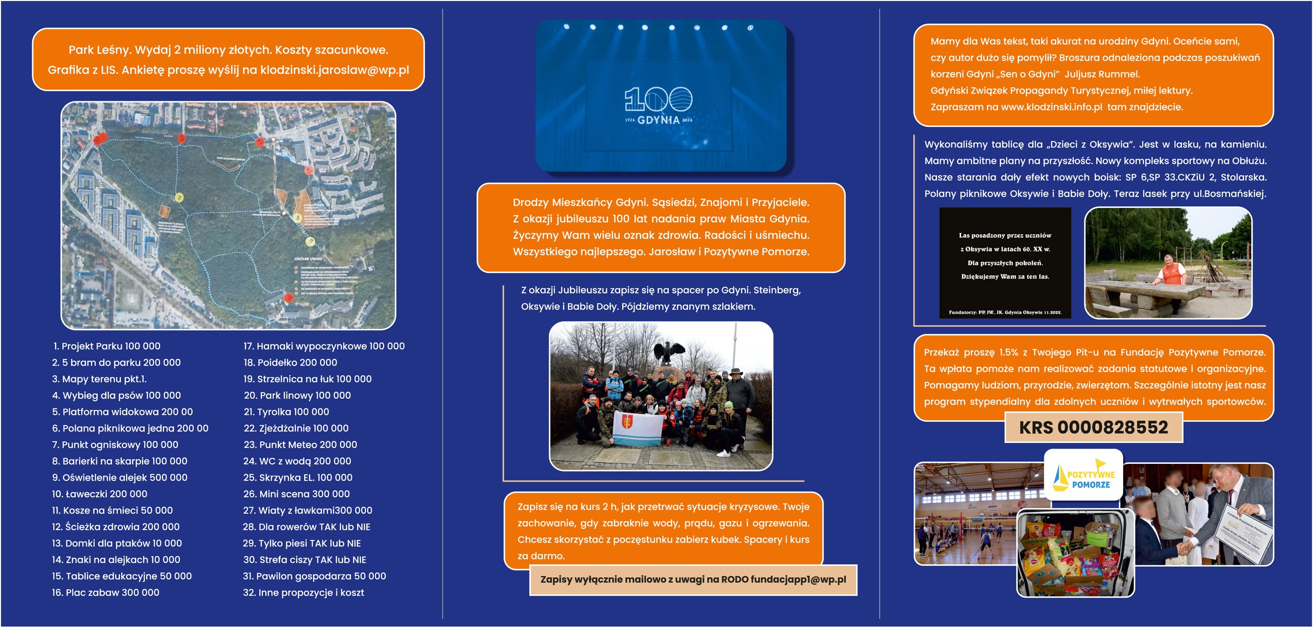 2026.02.10 - „SEN O GDYNI” JULIUSZ RUMMEL. JUBILEUSZ 100 LAT MIASTA. ![]() Przekaż 1.5 dla Fundacji Pozytywne Pomorze na stypendia dla dzieci młodzieży. Wypowiedz się w kwestii powstania Parku Leśnego na Oksywiu. Zabierz głos z mini referendum. Ważne sprawy dla Gdyni. Zapisz się na szkolenie z przetrwania w mieście w czasie kryzysu –za darmo. Zapisz się na wycieczkę po Gdyni. Soboty lipca 2026. 11.07 –Oksywie Górne, 18.07 Oksywie Dolne ; 25.07 Babie Doły. Organizator Fundacja Pozytywne Pomorze i dr Jarosław Kłodziński Zapisz się na spotkanie z obiektami militarnymi w Polsce i zagranicą 29.08.2026 Wesprzyj kanapką Lodówkę Społeczną. Dla głodnego to duża sprawa. Czynna od 2020 roku. Szukasz punkty dla dziecka do szkoły średniej. Możemy Tobie to ułatwić. Organizujemy trzecie miejsce piknikowe na ogniska, tym razem Oksywie. ![]()