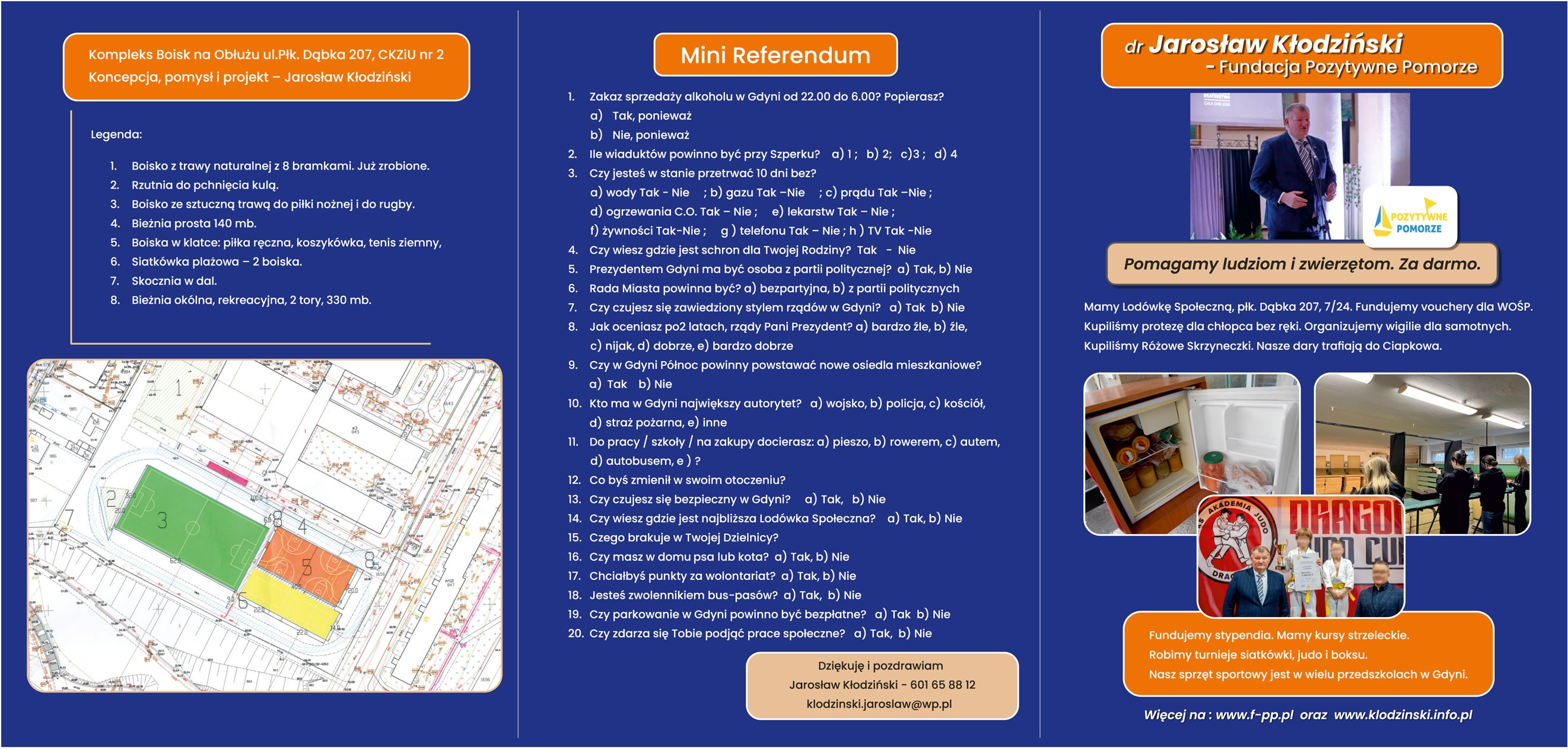 Jarosław Kłodziński to klasyczny filantrop, pomagający ludziom i zwierzętom. Wiosna tego roku zawiózł do Przedszkola w Gościnie sprzęt sportowy, który im brakował. Fundator noclegu w schronie pod Wielkiej Orkiestry Świątecznej Pomocy, dla Szpitali Pomorskich dostarczył tysiąc plastikowych przyłbic w czasie pandemii, gdy tego sprzętu nie było na rynku. ![]() ![]() ![]() dr Jarosław Kłodziński to współorganizator Pomorskiego Eko Forum w Gdańsku Jako członek Zarządu Związku Miast i Gmin Morskich wprowadził uczestników w tematykę konferencji „Wspólnie dla klimatu” ![]() ![]() ![]() ![]() Klimatyczna Gmina 2023 to konkurs w ramach Pomorskiego Eko Forum. Razem z wiceprezydent Gdańska mieliśmy zaszczyt wręczyć nagrody najlepszym gminom według jury. ![]() ![]() ![]() ![]() Pozytywne Pomorze, CKZiU 2, dr Jarosław Kłodziński zapraszają na przedszkolne zawody pelne radości i dobrych emocji. Ilość miejsce ograniczona. Regulamin na www.klodzinski.info.pl Zapisy na fundacjapp1@wp.pl , kontakt 601 65 88 12 ![]() ![]() ![]() LETNI SPACER PO PORCIE WOJENNYM GDYNIA OKSYWIE 19.08.2023 Pozytywne Pomorze, dr Jarosław Kłodziński przy uprzejmości d-cy 3. Flotylli Okretow Zapraszają na wyjatkowy spacer. Ilosc miejsc ograniczona. Datek do puszki 50 zł/od osoby na proteze dla Maksymiliana. Rezerwacja miejsc wyłącznie mailowo na fundacjapp1@wp.pl , kontakt 601 65 88 12 Dane: imię i nazwisko, obywatelstwo, rok urodzenia, aktualny nr telefonu. ![]() ![]() KASZUBSKA BASZKA CZERWONA W GDYNI – 17.09.2023 Pozytywne Pomorze, Pucka Liga Baśki, dr Jarosław Kłodziński zapraszają na turniej karcianej gry stolikowej – Kaszubska Baśka. Uczestnicy powalczą o 3 puchary: Prezydenta Gdyni, Prezes Fundacji Pozytywne Pomorze, Przewodniczącego Komisji Sportu Rady Miasta, nagrody rzeczowe i nagrody finansowe. Sędzia główny zawodów: Henryk Radtke z Puckiej Ligi Baśki. Turniej dla Pań i Panów odbędzie się w niedzielę 17 września 2023 roku w sali gimnastycznej od godz. 14.00. CKZiU 2 w Gdyni ul. Płk. Dąbka 207. Zasady organizacyjne i regulamin gry ogólnie przyjęte na Kaszubach. Patronat honorowy Prezydent Miasta Gdynia dr Wojciech Szczurek. Kontakt 601 65 88 12, www.klodzinski.info.pl ![]() AKTYWNOSCI RADNEGO I WSPOMNIEN CZAR Charytatywny Turniej pilkarski z kolegami radnymi z Gdanska, Festiwal pilki Niżnej dla dzieci z hospicjum na Oksywiu, Starter w biegach ulicznych z maskotkami. ![]() ![]() ![]() ZADOWOLENIE DZIECI NA BUZIACH TO NAJLEPSZA NAGRODA DLA RADNEGO I SPOLECZNIKA Zabawa w kucharzy, Mikolajki, nowe boiska, przygotowania do Olimpiady Przedszkolaka. ![]() ![]() ![]() ![]() ZADANIEM RADNEGO TO DBALOSC O DROGI, CHODNIKI I SCIEZKI ROWEROWE ![]() ![]() ![]() ![]() WIGILIA DLA SAMOTNYCH Od wielu lat wspieram to pozytywne dzielo dla ludzi w potrzebie. 20 lat temu byłem fundatorem posiłków świątecznych. Potem współorganizatorem u O.O. Franciszkanow, obecnie w VI LO. Przygotowujemy paczki, przewozimy je do miejsca konsumpcji, wydajemy potrawy. Kilka godzin intensywnej pracy społecznej. Radny to sluzba przez caly czas kadencji. To wydatki, zakupy i wspieranie tych, którzy tez maja czas dla innych. Za kilka miesięcy czas podsumowan. Poki sa sily i werwa działamy dalej. ![]() ![]() ![]() ![]() OGOLNOPOLSKI TURNIEJ MINI SIATKOWKI DZIEWCZAT Bardzo często decydujemy się pomagac przy organizacji imprez sportowych dla lokalnych klubow. W Wielki Czwartek raze, z Gdynska Akademia Siatkowki, Fundacja Pozytywne Pomorze odbyl się turniej Siatkówki w CKZIU 2. Na trzech boiskach odbyly się dziesiątki meczy dwustu zawodniczek. Dla mnie przypadl zaszczyt otwarcia turnieju i dekoracji najlepszych. Duże podziękowania dla Przemek Surazynski i Karol Cieminski. Gratulacje dla wygranych. ![]() ARKA GDYNIA - NASZ GDYNSKI KLUB PIŁKARSKI Po rozmowie z Wiesław Niespodziewany wiem jak duza liczba ludzi i organizacji społecznych jest zaangazowana w idee, aby Arka Gdynia dawała nam radosc z kibicowania i niosła tylko pozytywne emocje. List do Prezydenta Gdyni w sprawie Panow Kołakowskich. Nie wiem czy to zbieg okolicznosci, ze list dotarł do Urzędu Miasta na kilkadziesiat godzin przed decyzja o wstrzymaniu finansow, czy po prostu była ta kropelka, ktora przelała szale ku jedynej i dobrej decyzji. Panu Prezydentowi już podziękowałem za dobra wiadomosc. Zyczę Wam, aby ten masz wspOlny koszmar szybko się zakonczył. ![]() ![]() ![]() ![]() ![]() ![]() ![]() ![]() NAGRODA GLOWNA W POTYCZKACH PRZEDSZKOLAKOW 2023 Najwieksza liczba uczestnikow nagrodzona. Zestaw do koszykowki przyznany dla Przedszkola nr 11. Wielkie gratulacje i zapraszamy za rok. Pierwsza sobota czerwca. ![]() ![]() ![]() ![]() KONKURS FOTOGRAFICZNY – 7 DNI Z ZYCIA PRZEDSZKOLAKA Nowa premierowa inicjatywa dla rodzicow dzieci przedszkolnych. W roku 2024 także dla dzieci szkolnych. Nagroda glowna – film reklamowy o przedszkolu. Dwie drugie nagrody – sesja zdjeciowa dla grupy dziecka biorącego udzial w konkursie. ![]() ![]() ![]() ![]() ZBIERAMY DATKI DO PUSZKI DLA MAKSYMILIANA Jaroslaw Klodzinski inicjatorem powstania Komitetu Spolecznego, którego zadaniem jest pomoc dla chłopca z Gdyni bez lewego przedramienia. Razem z Fundacja Pozytywne Pomorze organizują letnie spacery po obiektach militarnych w Gdyni. Datki do puszki w 100% trafiaja do rodzicow Maksymiliana ![]() ![]() KONIEC ROKU SZKOLNEGO W V LO NA OKSYWIU W gronie znajomych ostatni dzien w roku szkolnym. Okolicznościowa przemowa i gratulacje dla Rady Pedagogicznej i Uczniow. Do zobaczenia w nowym roku szkolnym 2023-2024. Udanych wakacji i dobrego wypoczynku dla wszystkich. ![]() ![]() ![]() Pierwsza sobota czerwca to czas rywalizacji przedszkolaka i jego rodzica jako team. Na nasze zaproszenie odpowiedzialy gdyńskie przedszkola. To była kolejna edycja Potyczek. Przedszkola rywalizowaly miedzy soba o medale, puchary i nagrody rzeczowe. Wszyscy walczyli Fair Play. Za rok ponownie starcie na Dzien Dziecka. Podczas turnieju